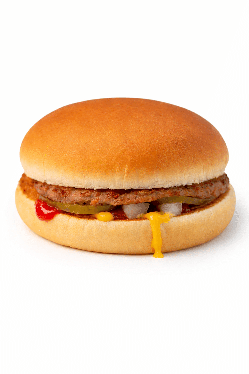 Карамелизированная булочка, солёный огурец, говяжья котлета, кетчуп, горчичный соус, лук