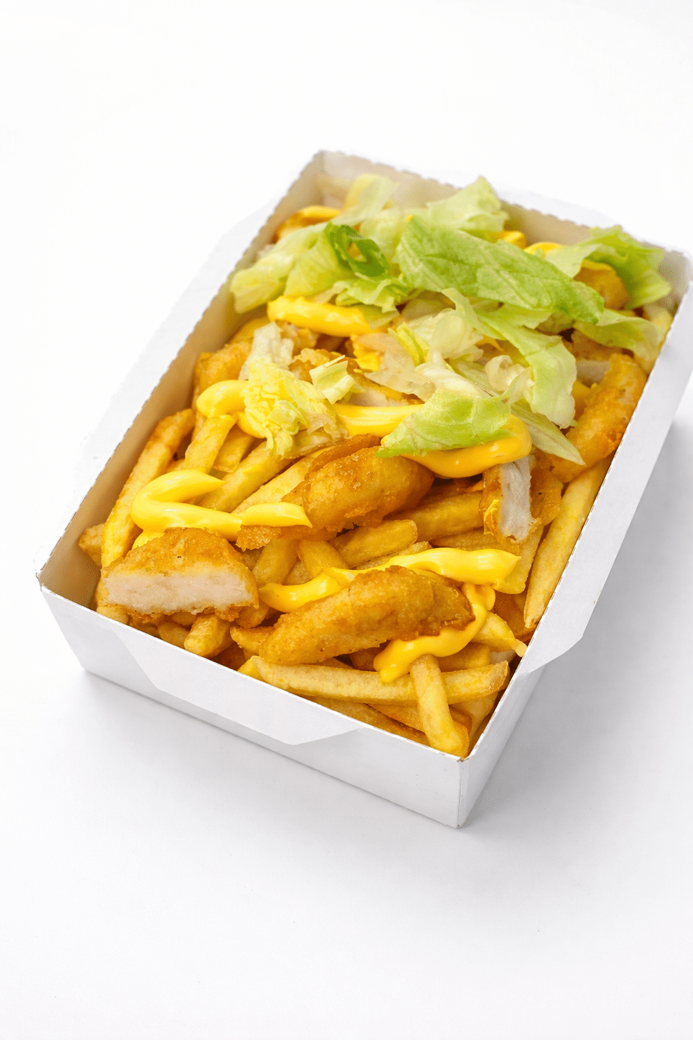 Сырный соус, куриное филе в панировке, фри, сыр, салат айсберг