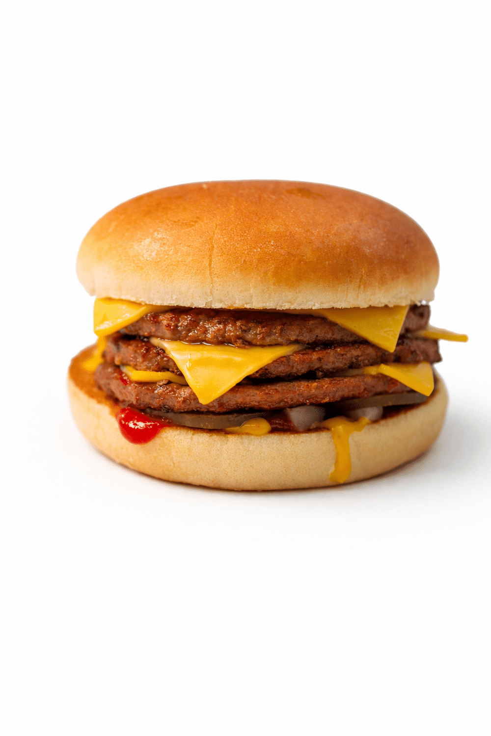 Карамелизированная булочка, сыр чеддер, солёный огурец, три говяжьи котлеты, кетчуп, горчичный соус, лук